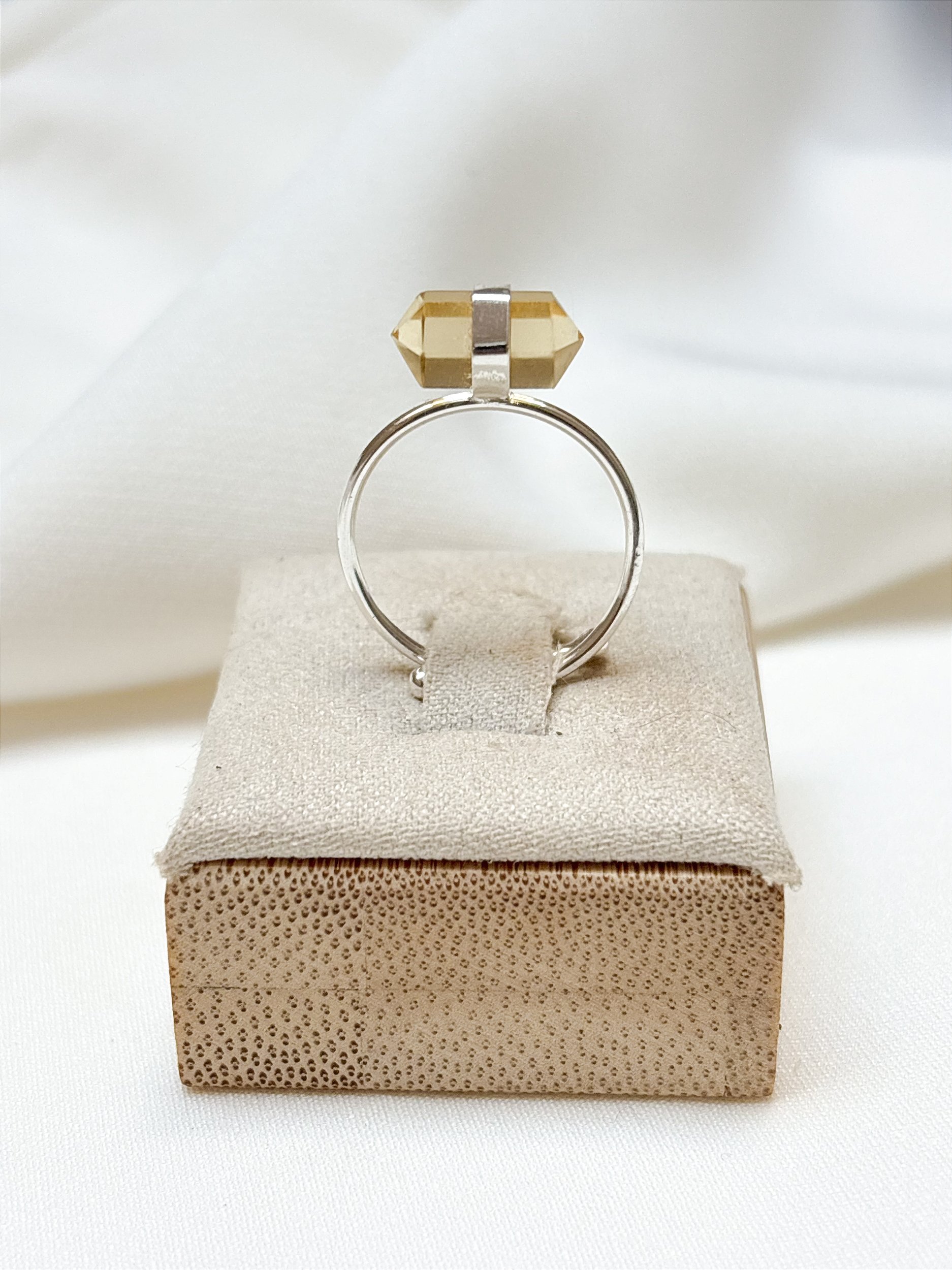 Elegância e energia se encontram neste anel ajustável de Citrino com design biponta, confeccionado em Prata 950. A lapidação dupla realça o brilho dourado da pedra, refletindo sofisticação e leveza. O aro e o ajuste confortável tornam a peça perfeita para o uso diário ou para compor combinações únicas com outras joias naturais.