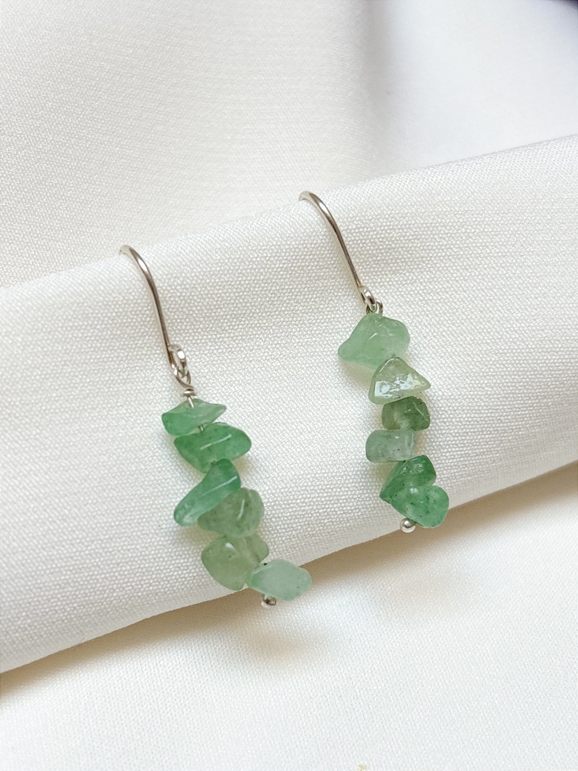 O Brinco Luna é pura conexão com a natureza. Feito com cascalhos de Quartzo Verde natural e acabamento em Prata 925, tem 3,8 cm de comprimento e um design orgânico e sofisticado. Uma peça que combina o brilho suave da prata com a energia natural das pedras.