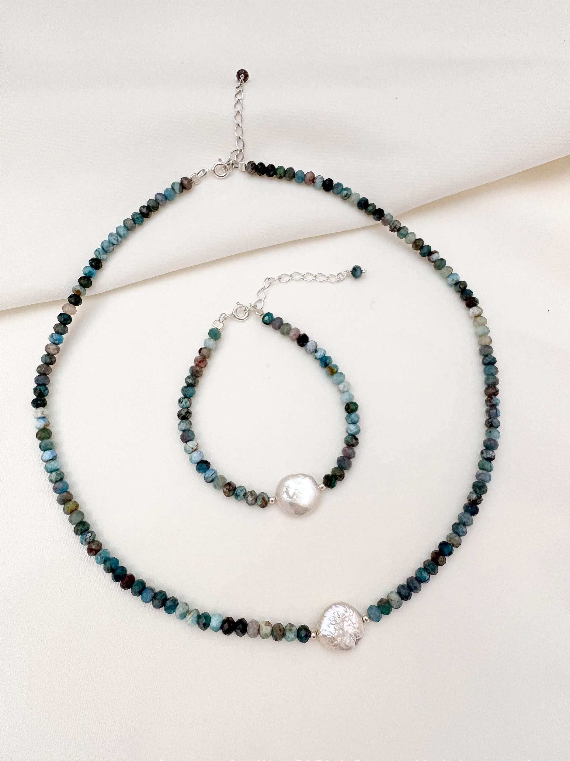 A Apatita é uma pedra de inspiração e clareza mental, que auxilia na expressão pessoal e no equilíbrio emocional. Já a Pérola Biwa simboliza pureza e serenidade, conectando quem a usa com sua energia interior. Juntas, elas promovem calma, autenticidade e uma aura de leveza e paz.
