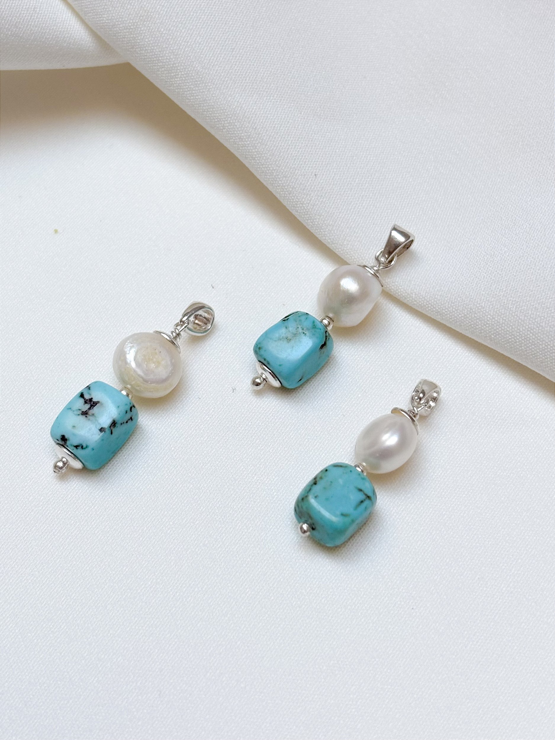 Elegante e cheio de contraste, o Pingente Turquesa e Pérola Pão Prata 925 une o azul vibrante da turquesa com o brilho suave da pérola natural em uma composição harmoniosa. Com cerca de 3cm, é uma joia que reflete equilíbrio e sofisticação.
